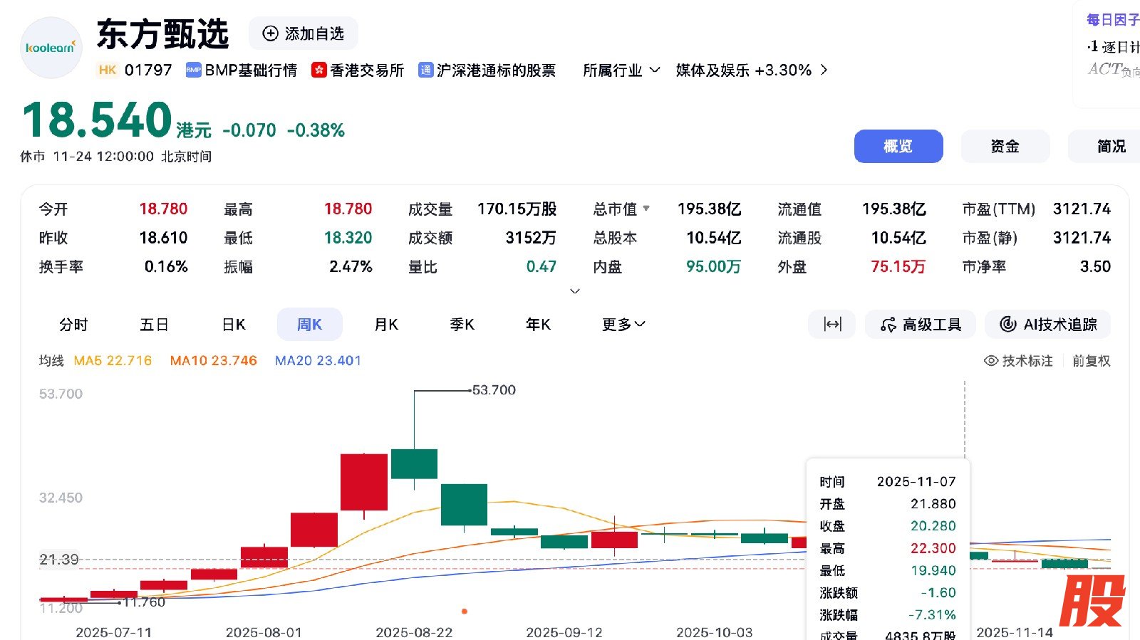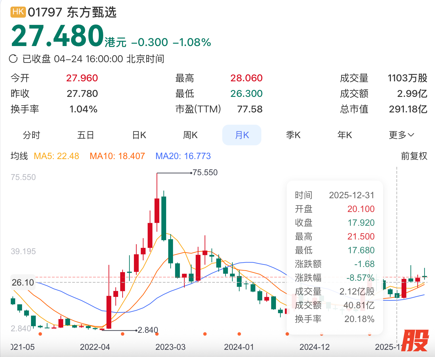 年初至今,东方甄选股价由17.92港元涨至上个交易日的27.48港元,涨53.3%。