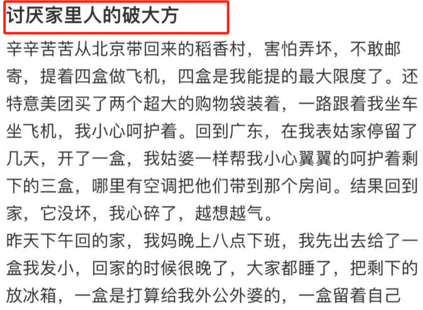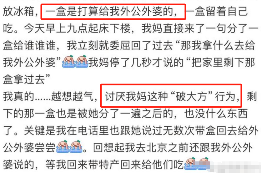 由于还在实习期,自己的工资不算高,因此只能从当地买了四盒精致的糕点带回去,当做给父母以及感情深厚的亲人朋友作为礼物,可没想到就是这份精致的糕点,让女孩当场破防控诉自己的父母。