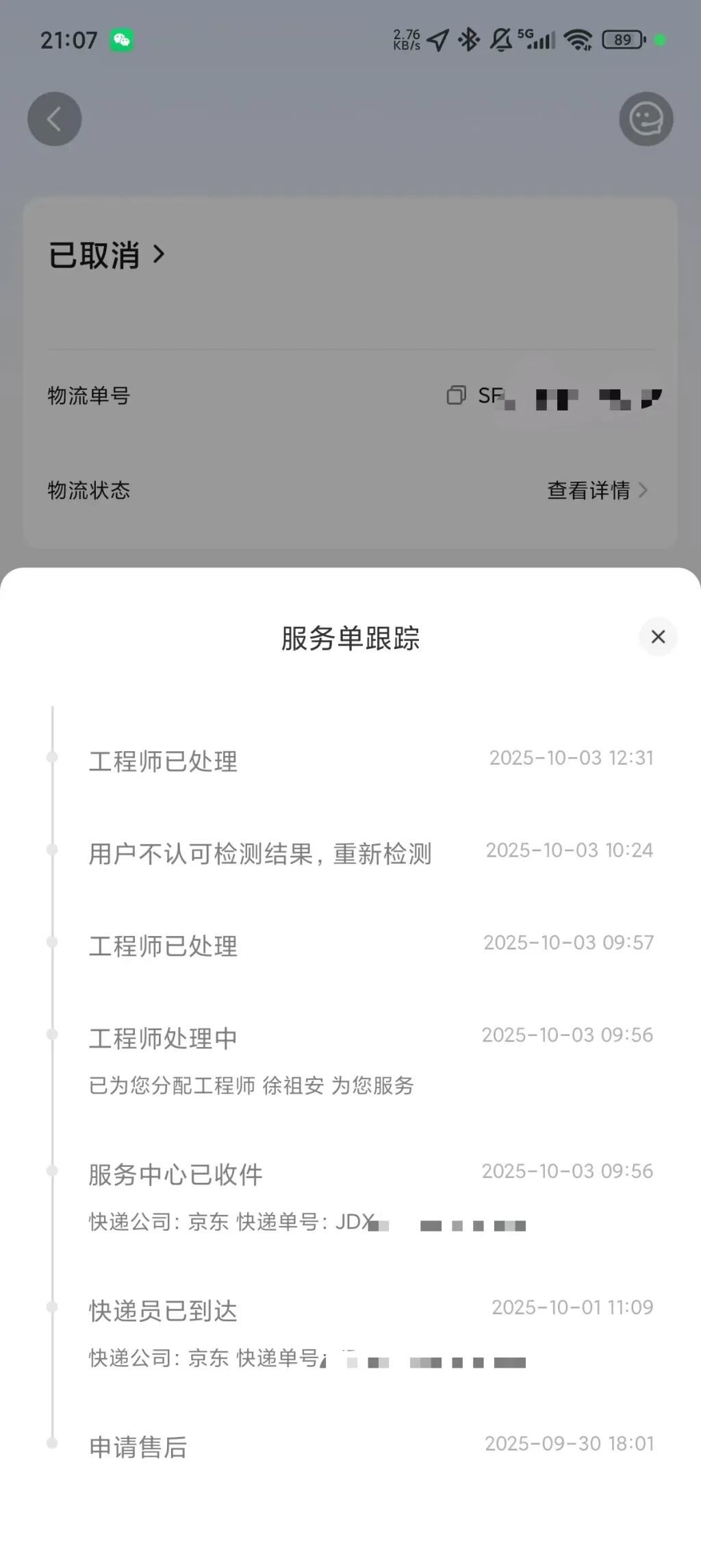 程先生出现问题的“红米K50”手机维修进度单。